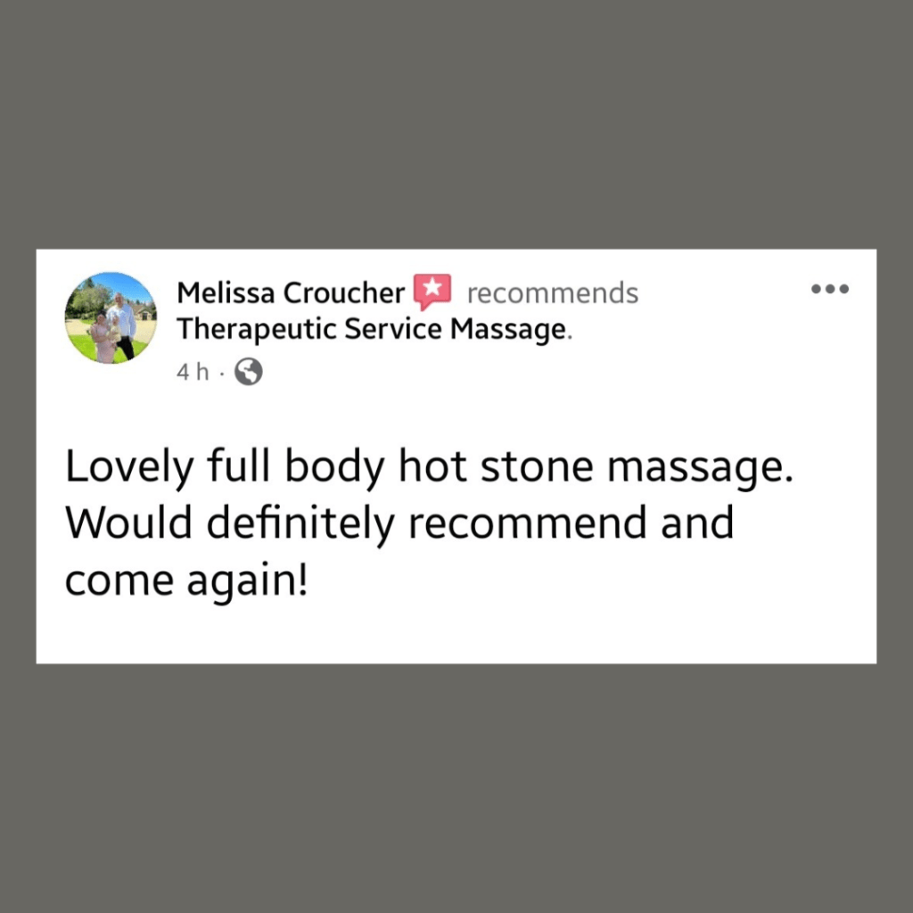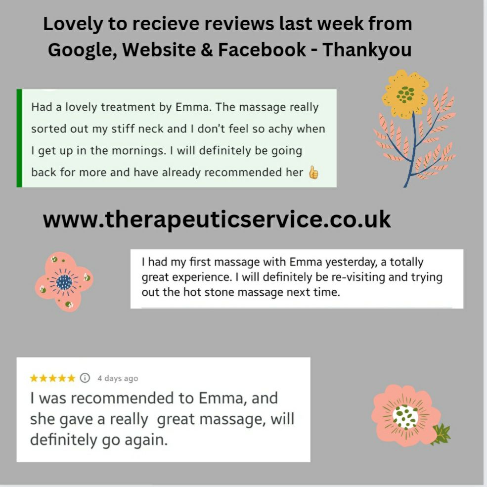 Lovely to receive a new Facebook Review today. Thank you Melissa for taking the time to post. Please follow & like me on Facebook at emmatherapeuticservice