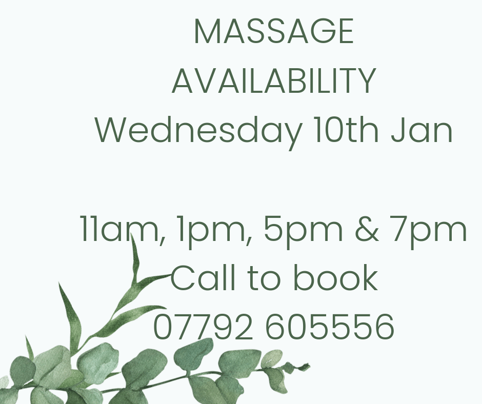 Appointments now available daytime Wednesday 13th August, evening on 14th & 15th August. Massage or call to book 07792 605556